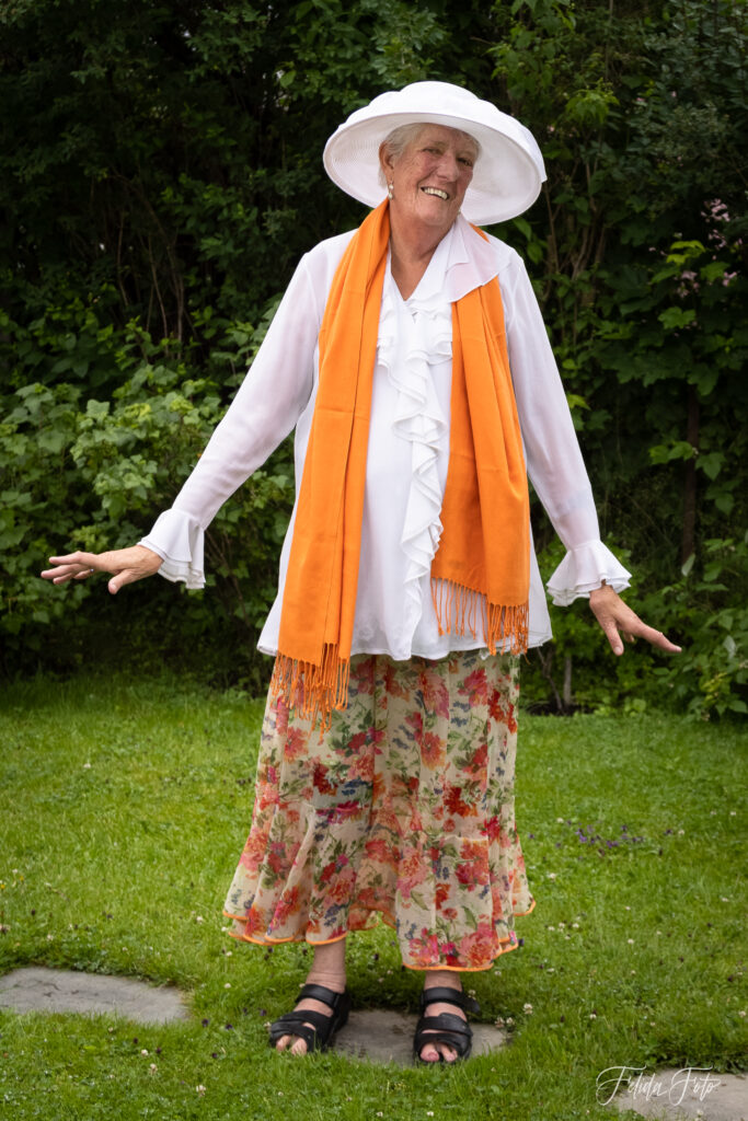 Antrekkene som består av hatt, sjal, overdel og skjørt er kjøpt inn over år og satt sammen av meg. Det er viktig at sjalet fanger opp fargen i skjørtet eller overdelen.